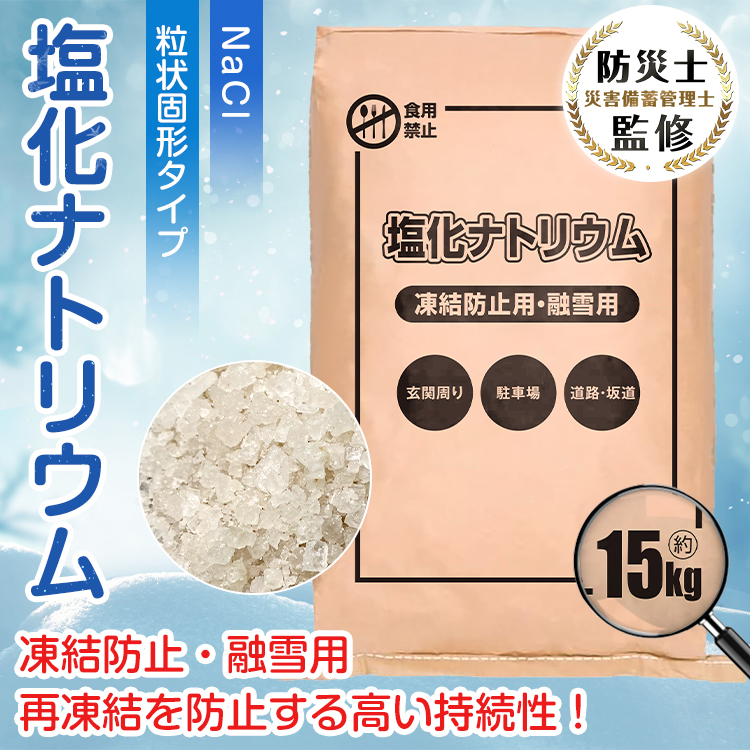 融雪剤 凍結防止剤 塩化ナトリウム 15kg 持続性 再凍結防止 粒状固形タイプ 雪対策 除雪 冬 道路 駐車場 撒布 環境 寒気 玄関 階段 坂道