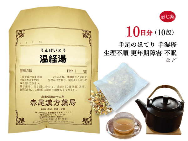 月経不順、月経困難、こしけ(おりもの)、更年期障害、不眠、神経症、湿疹、皮膚炎、足腰の冷え、しもやけ、手荒れ(手の湿疹、皮膚炎)