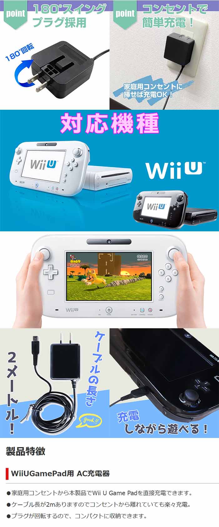 ●家庭用コンセントから本製品でWii U Game Padを直接充電できます。