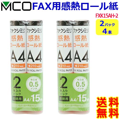 ミヨシ MCO FAX用感熱ロール紙 FXK15AH-2 A4 0.5インチ 15m巻 2本入【2パック4ロール】ファックス紙 faxロール紙 Fax用紙 fax 感熱紙【送料無料c】