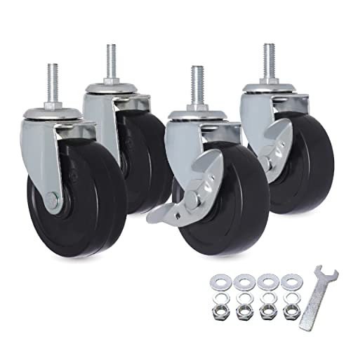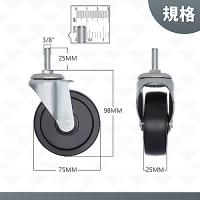 ・4 個セットキャスターホイール - 2 個はブレーキなし、2 個はブレーキ付き。 ホイールの直径は3インチ(75mm)、ネジ付きステムの直径:3/8インチ(約9.2-9.6mm)、ネジ付きステムの長さは1インチ(25mm)です。 パッケージにはキャスター4個、調整ナット4個、ワッシャー、レンチが付属しています。