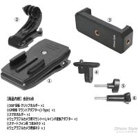 ・ウェアラブルカメラ・アクションカメラ だけでなく、スマホ にも対応、360°回転/前後アングル調整可能 クリップ式 クランプ ホルダー / 360度 回転式 マウント アダプターと両手が塞がる状態での撮影に便利な( 脱着可能タイプ)スマホホルダーのセット商品;2か所のジョイント部分で自由な角度調整が可能、リュックサック、バックパック、ザック、タクティカル バッグ、ショルダーバッグ、などのカバンのベルト、Molleシステム、チェストストラップ、ハーネス、ウエスト ベルト等、速写クイックストラップ等に強力なクリップで洗濯ばさみの様に挟んでスマートフォン・携帯電話 を取り付けて手ぶらで動画撮影が出来ます。取り付け位置を調整して主観視点 POV・目線カメラでの動画撮影も出来ます。 厚さ約2.2cmまでの対象物に挟み込んで保持ができ、撮影以外でも本立てなど薄い物に挟み込んでスマホやウェアラブル カメラスポーツカメラを保管する際などにも使用できる便利な撮影アクセサリーです。