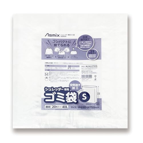 アスカ シュレッダー専用 ゴミ袋 SDB20S 20枚入り Sサイズ W650×H750mm+マチ付き 40L 透明 空気抜き 静電気を防ぐ