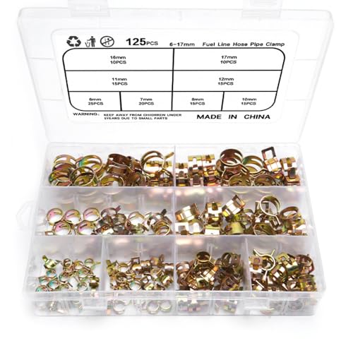・4.セット内容:ホースクランプ *125個入り。M6*25pcs、M7*20pcs、M8*15pcs、M10*15pcs、M11*15pcs、M12*15pcs、M16*10pcs、M17*10pcs。内径:Φ6mm-17mm。