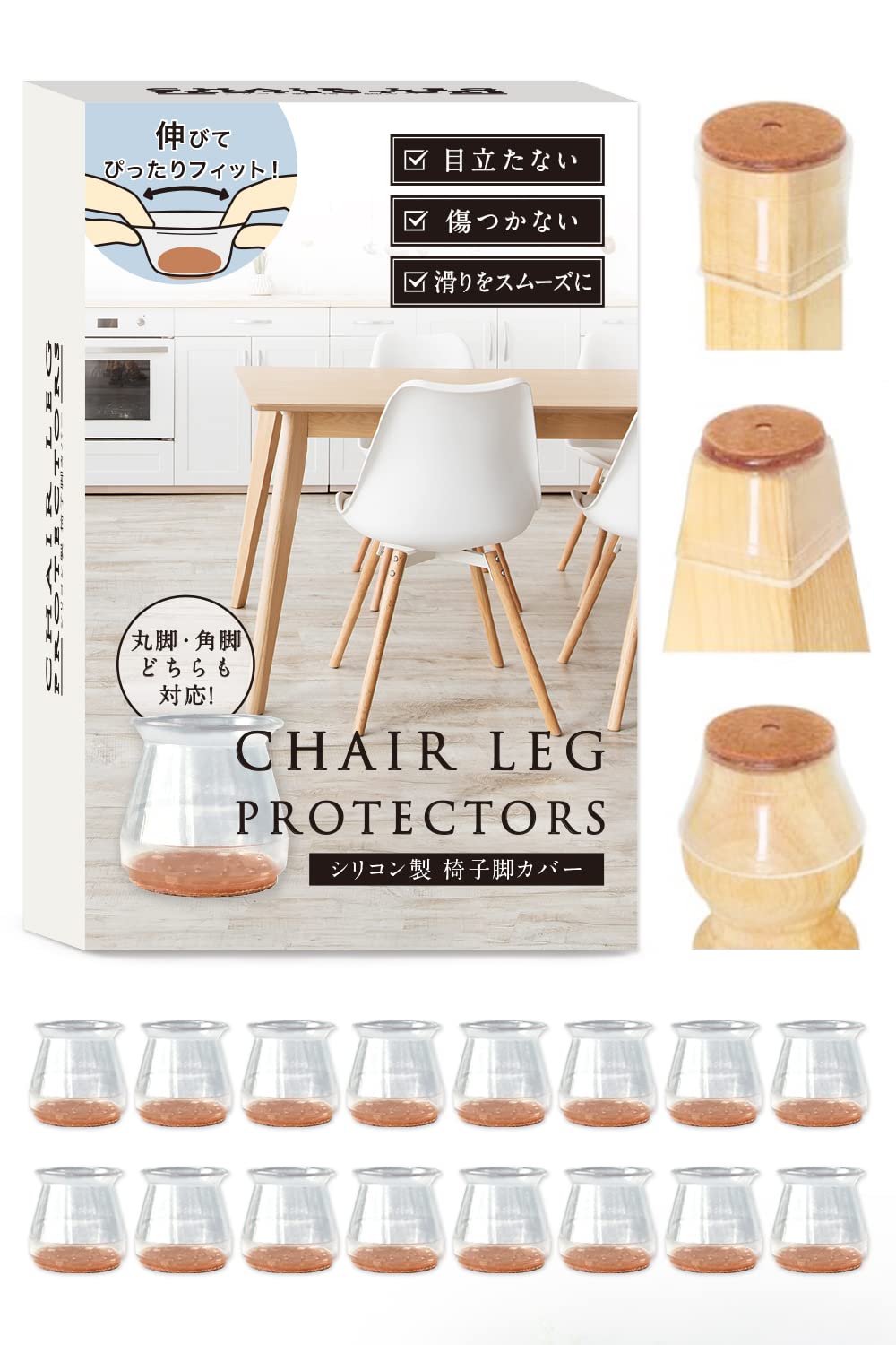 ・あらゆる形にフィット コペルタ 椅子足カバーは、正方形、円形、長方形など、あらゆる脚の形状に対応できます。 リビング用のいすはもちろん、キッチン用チェア、カウンターチェアなどにも活用します。 形状により、椅子足の周りをフィットするように成型してくれます。