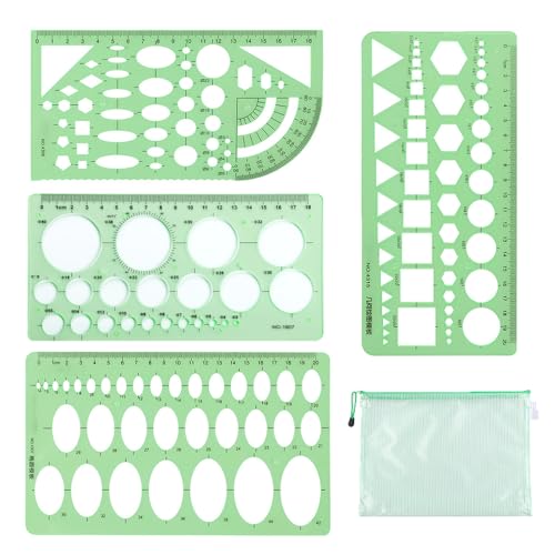 まちの波 テンプレート デザイン 透明 製図用 4枚入り 円定規 四角 楕円 三角 多形 組合せ定規 多機能 数理グラフィック 建築科用 収納袋