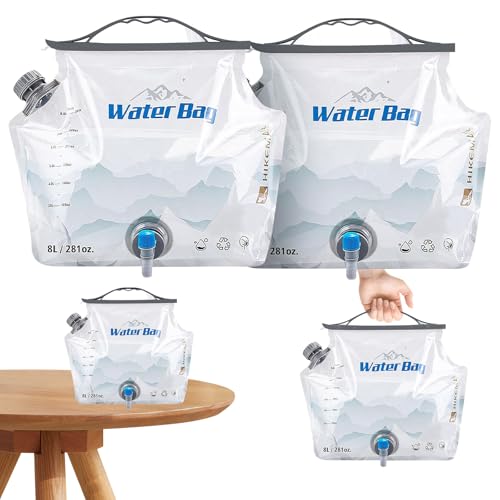 セット内容ウォーターバッグ 折り畳み(8 L)X2個、サイズ:約43cm x 35cm(たたんだ時:約43cmx 18 cm、蛇口付き)、重量:約140g、素材:PET/PA/PEの三層構造複合素材の採用。このウォーターバッグにはジュース飲料、ビール、生活用水、飲料水を入れることができます。(液体温度は0度?60度の間に押さえてください)。
