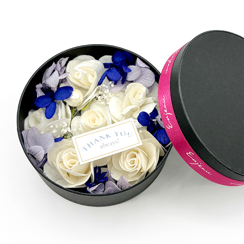 丸型プリザソラBOXは、ギフトボックスを開けるとふわっと良い香りが広がり、ギフトには大変オススメ。