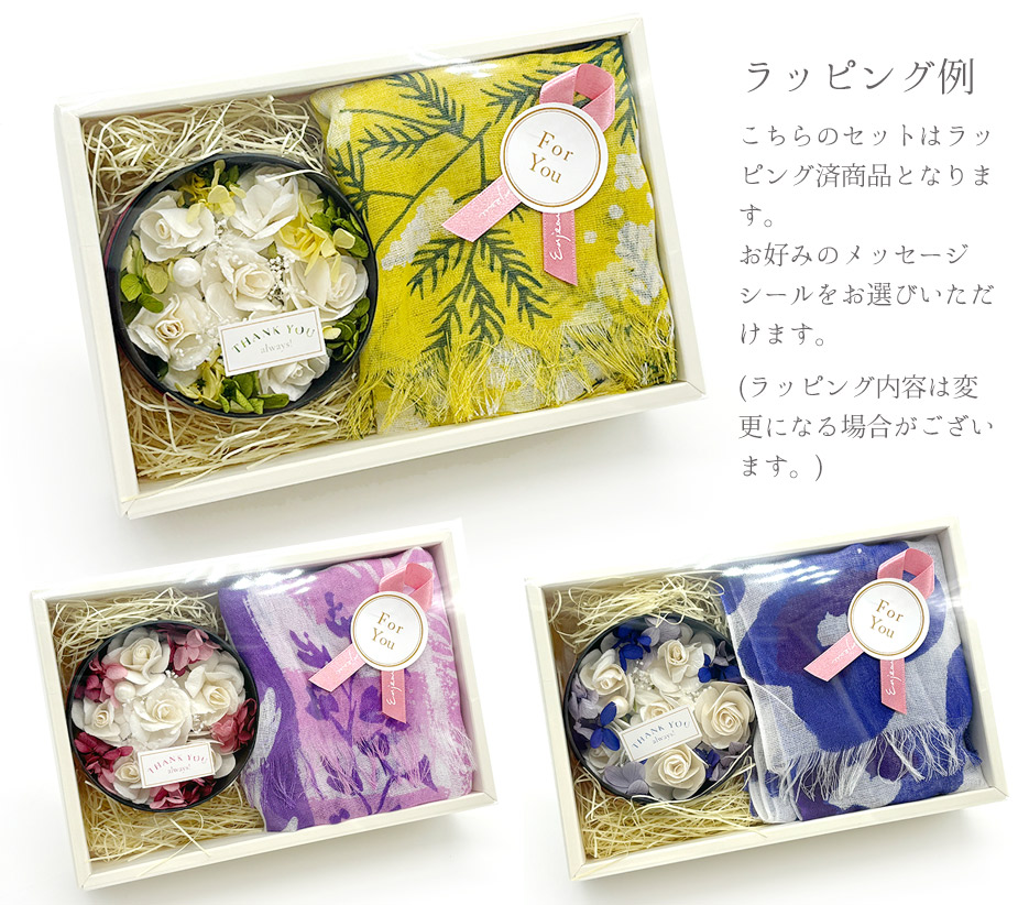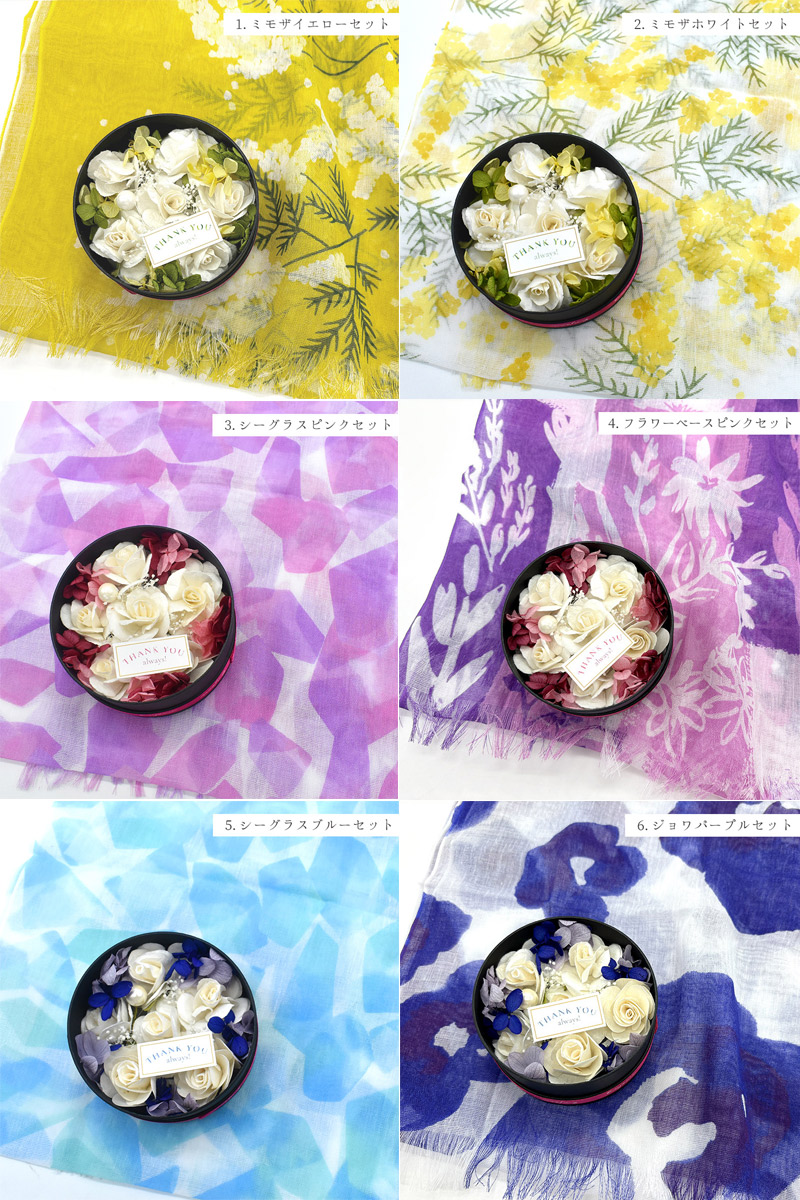涼しげで爽やかなコットンリネンストールと、ソラフラワーと鮮やかな枯れないお花・プリザーブドフラワーを丸型のシックなBOXに詰め込んだ特別セットです。