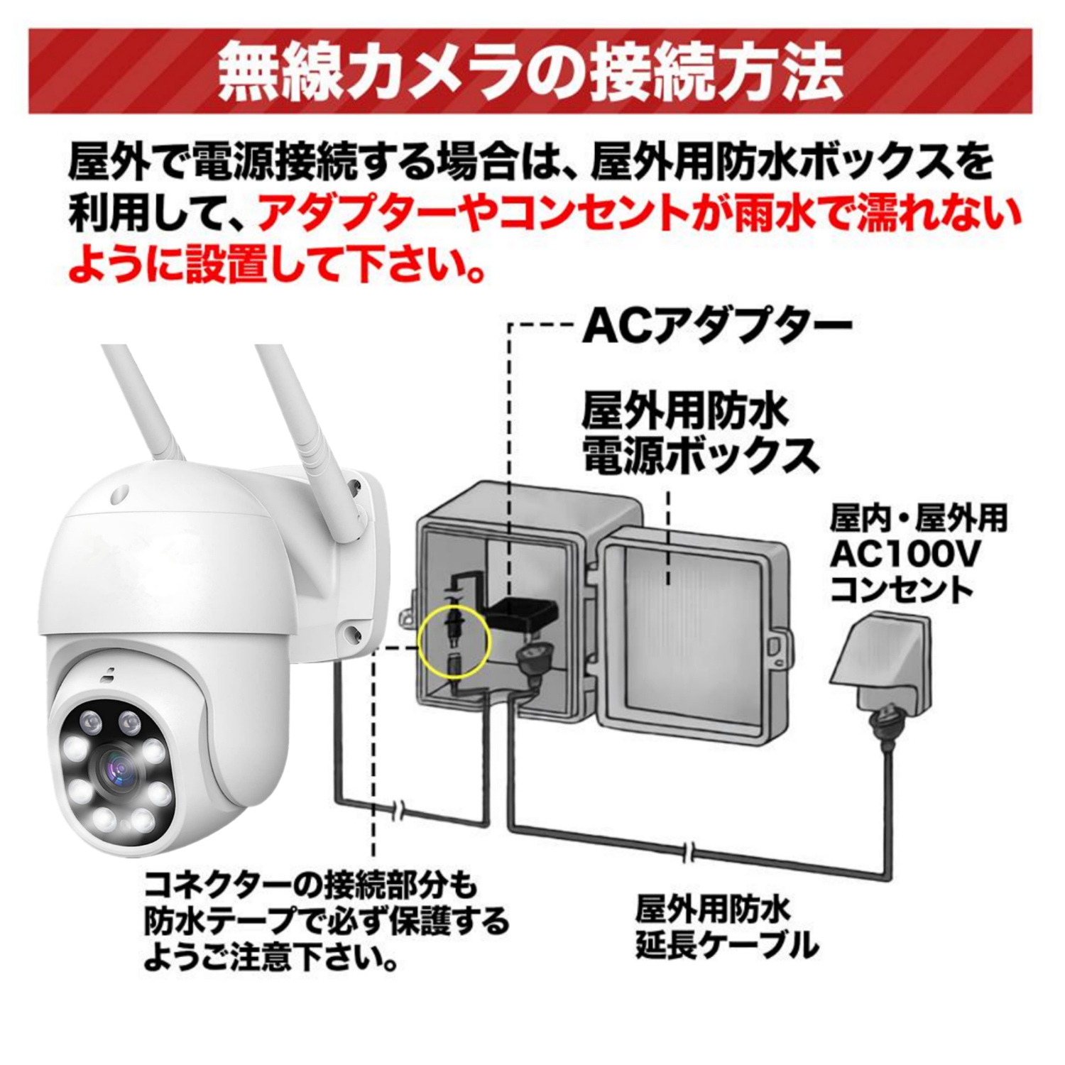 カメラ本体は防水ですが、配線や電源アダプターは防水ではありません。屋外設置時は必ず防水処理を行ってください。水濡れによる故障は保証対象外です。