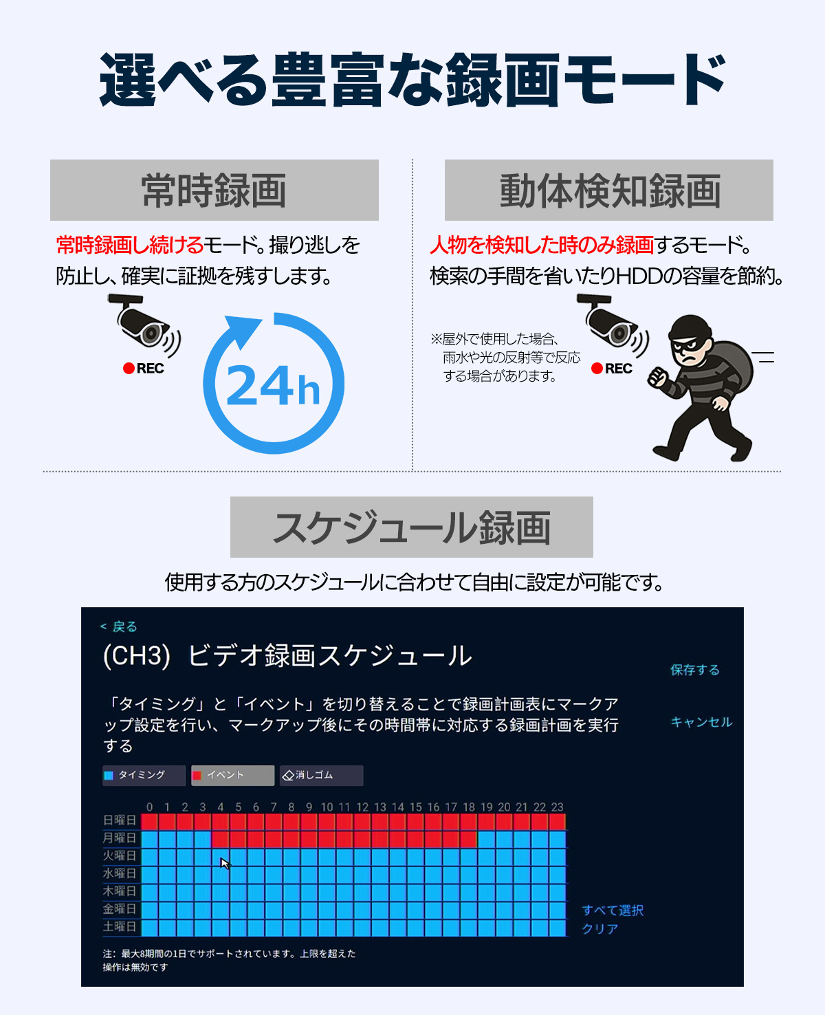 - 録画モード — 常時 / センサー / スケジュール