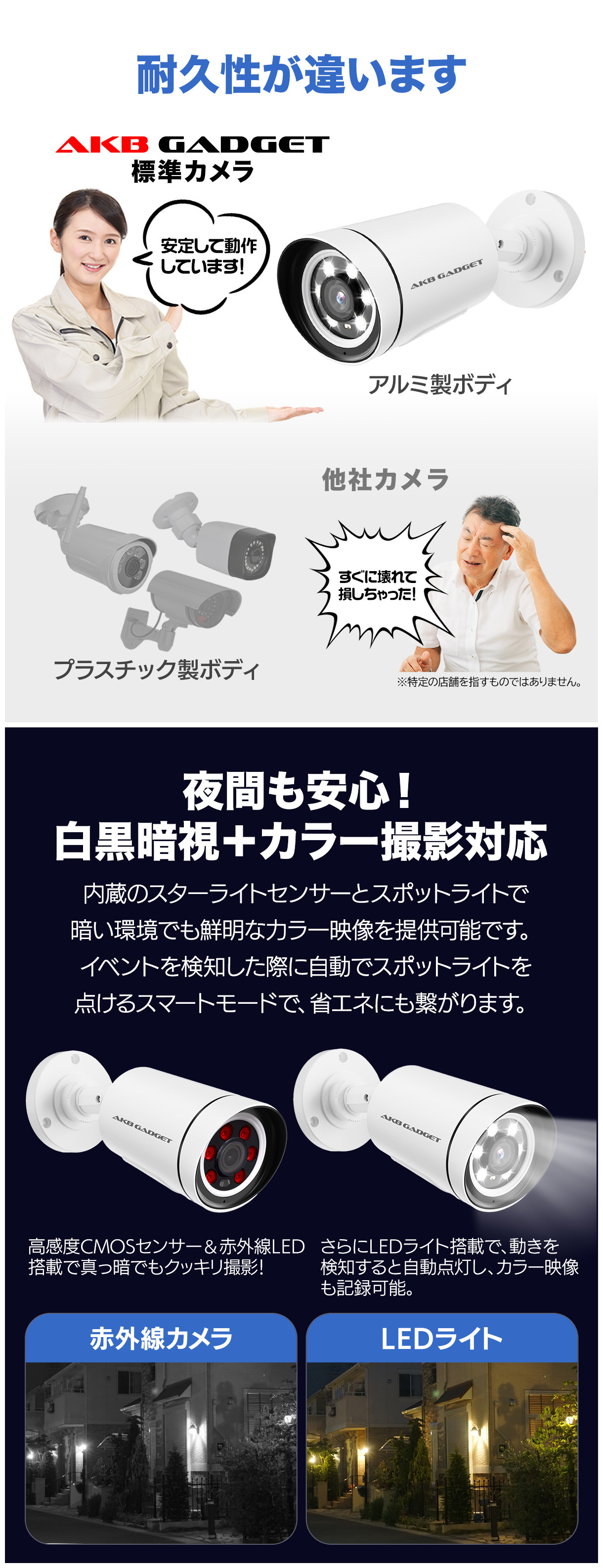 LED ライト搭載機種は夜間カラーに対応。(P-AC908は赤外線のみ)