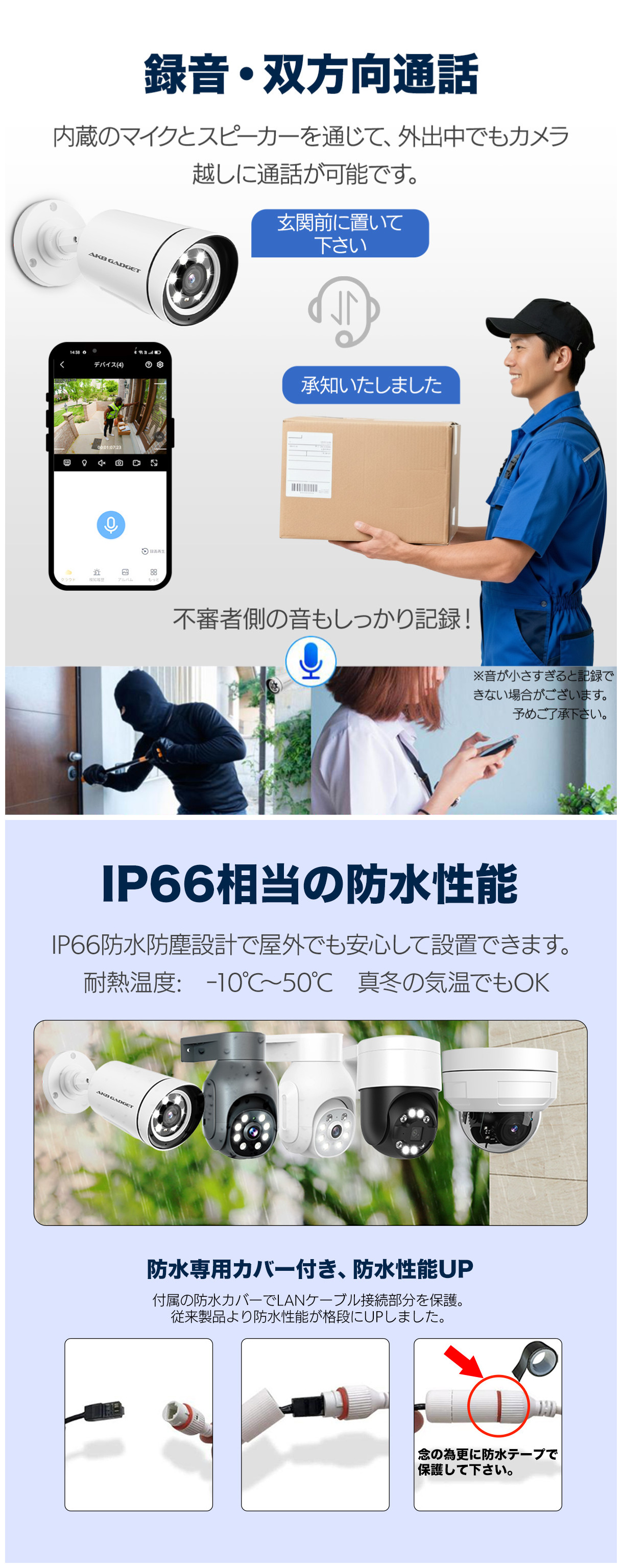 - 防水防塵 IP66 — 屋外でも安心
