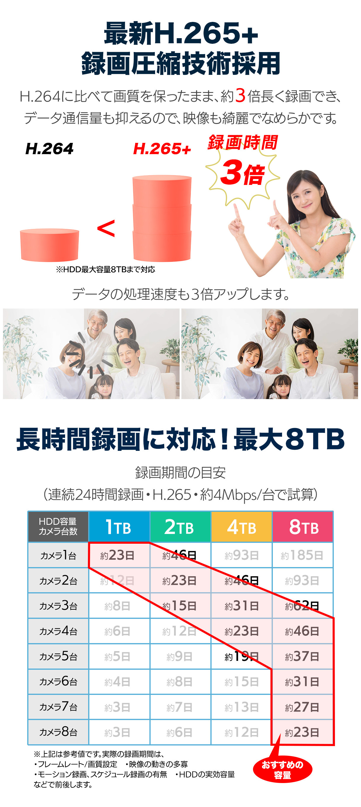 - HDD録画 — 最大8TB・満了時は自動上書き