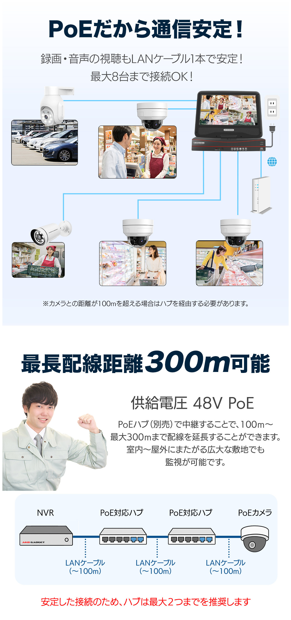 48V給電により最長100m、PoEハブ併用で最大300mまで延長可能。