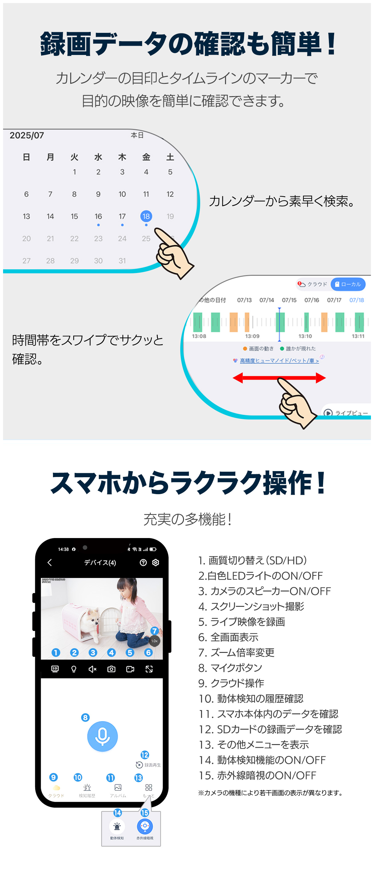 - 遠隔操作&通話 — スマホアプリでライブ視聴・双方向通話