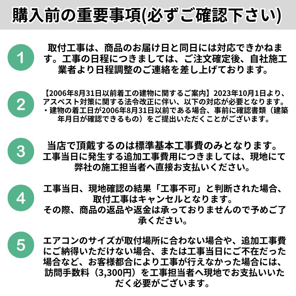 - 2023年10月1日よりアスベストに関する法律が改正・施行され、2006年9月1日より以前に着工された建物について特定の工事に対し有資格者による石綿の事前調査・分析が義務付けられ、エアコン取付の際に建物の着工日の確認が必要となりました。