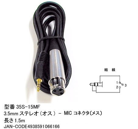 3pin Mic端子-3.5mmステレオ変換ケーブル 1.5m [XCR3-11C(メス)-3.5mmステレオ(オス)] comon 35S-15MF