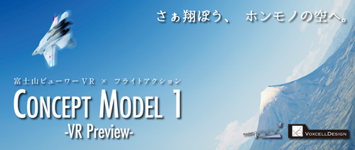 さぁ翔ぼう。ホンモノの空へ。世界文化遺産である霊峰富士。その近傍360キロメートル四方を自由に遊覧できます。また、Oculus Rift cv1やHTC ViveなどのVRデバイスを用意すれば、大迫力の空の旅を体験できます。Concept Model 1 - VR Preview - は合資会社VoxcellDesignが開発した「富士山ビューワーVR」を使用しています。富士山ビューワーVRは日本国 国土地理院が整備する基盤地図情報および基盤地図情報数値標高を元に、合資会社VoxcellDesi