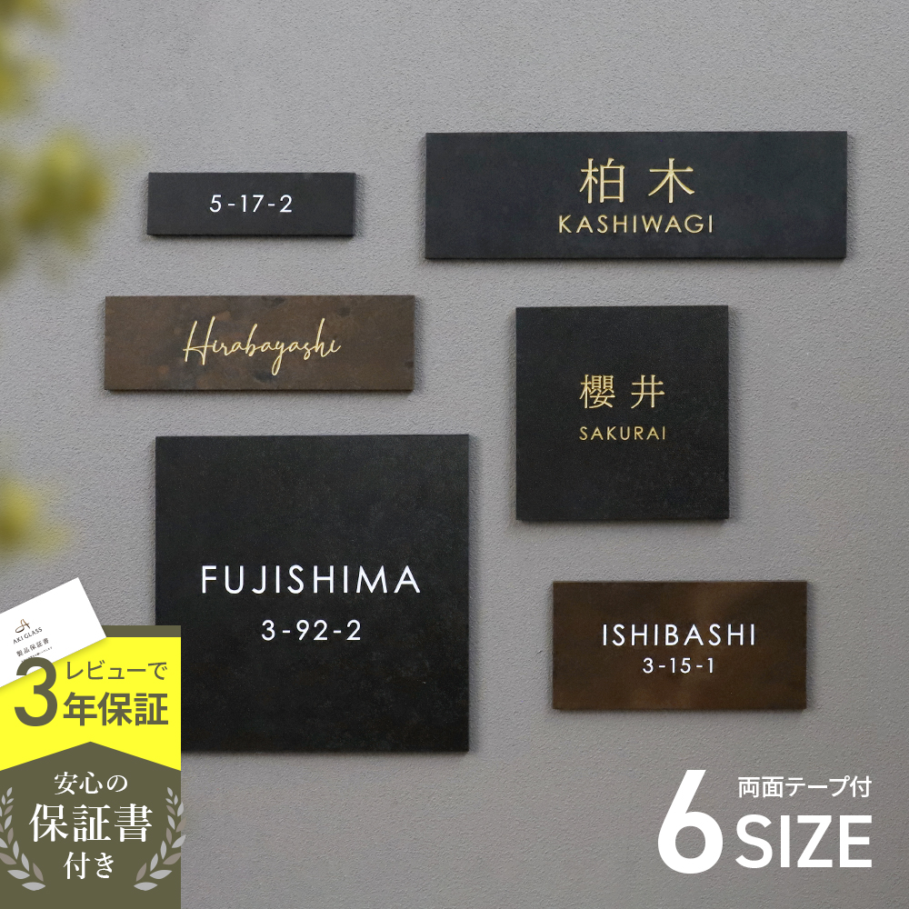 金属調の質感が魅力の薄型タイル表札。豊富なサイズ展開で6サイズから選べます。