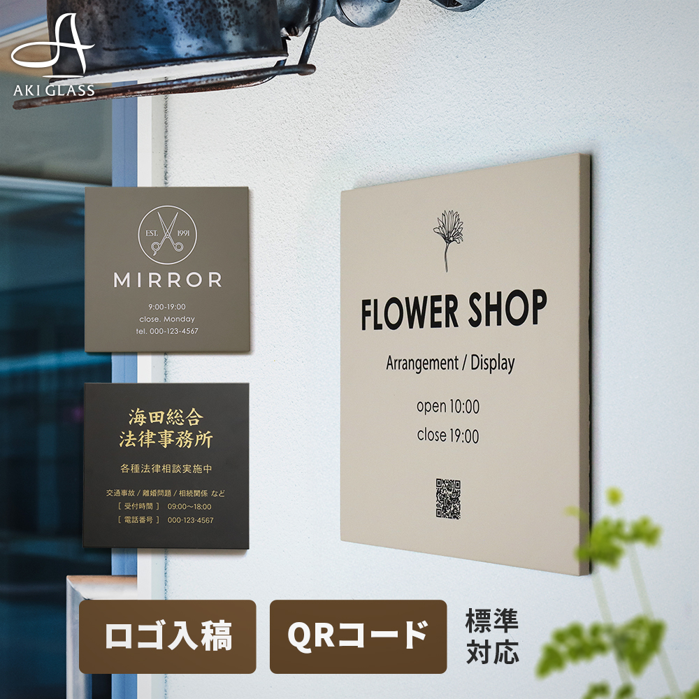 表札AKIグラスショップは、1987年に創業し、長年培って来たガラス加工技術を駆使したガラス表札を中心に、 それらの技術を応用したステンレス表札、タイル表札、異素材を組み合わせたオリジナルの表札を販売。商品開発から始まり、受注、表札デザイン、製造、組み立て、梱包、発送まで、すべて自社の工場で行っておりますので、 細やかな対応と心を込めた表札・製品作りが可能となっております。メイドインジャパンの高品質な表札づくりを実現させています。