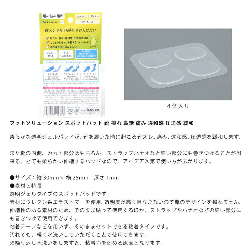 | 商品の説明 | 透明ジェルタイプのスポットパッドです。 素材にウレタン系エラストマーを使用。透明度が高く目立たないので靴のデザインを損ねません。 伸縮性のある素材のため、そのまま貼って使用するほか、 ストラップやハナオなどの細い部分にも巻きつけて使用できます。 粘着テープなどを用いず、そのままセットできる粘着タイプです。 汚れても、軽く水洗いしていただくことで使用できます。 (繰り返し水洗いをしますと、粘着力を弱める原因となります) 使用・保管上の注意 ・布地や表面に凹凸がある素材には粘着しない場合がありますので、ご使用になれません。 ・足に痛みを感じたら、すぐに使用を中止してください。 ・本品は治療用ではありません。血行障害・糖尿病の方、足裏に傷・湿疹・はれもの等のある方は医師に相談の上ご使用ください。 ・直射日光は避け、なるべく湿度の少ない乳幼児の手の届かない場所に本品パッケージに入れて保管してください。 ※取り外しが可能な粘着タイプのパッドですが、中敷きの素材によっては完全に圧着して外れにくくなります。 また、中敷きにベタつきやパッド跡が残る場合があります。 ※本品は直接足に貼らないでください。 使用上の注意 記載用途以外に使用しないでください。 |