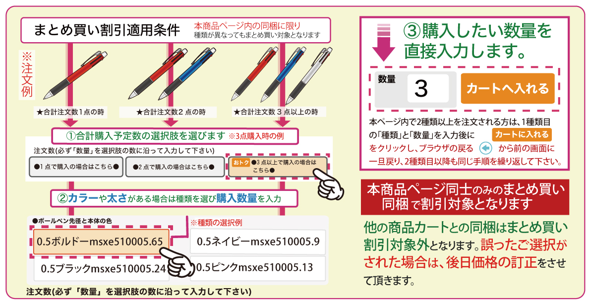太さやカラーが異なっても問題ございません※もしお客様が1点のご注文で誤って●2点での単価はこちら● や ●3点以上での単価はこちら●をお選びの場合は、当店にて価格を修正をさせていただきます。予めご了承ください。