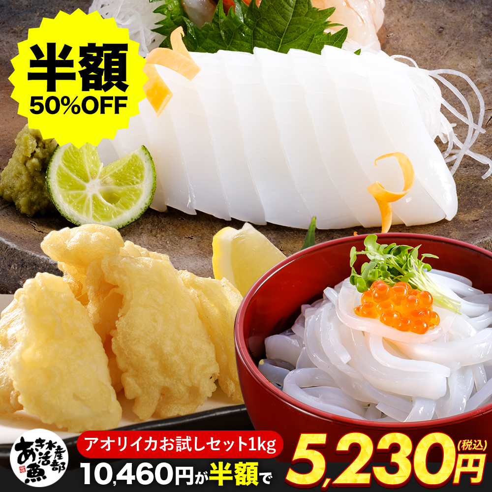 | 名称 | あおりいか お試しセット(むき身500g そ〜めん200g あおりいか天ぷら300g) |