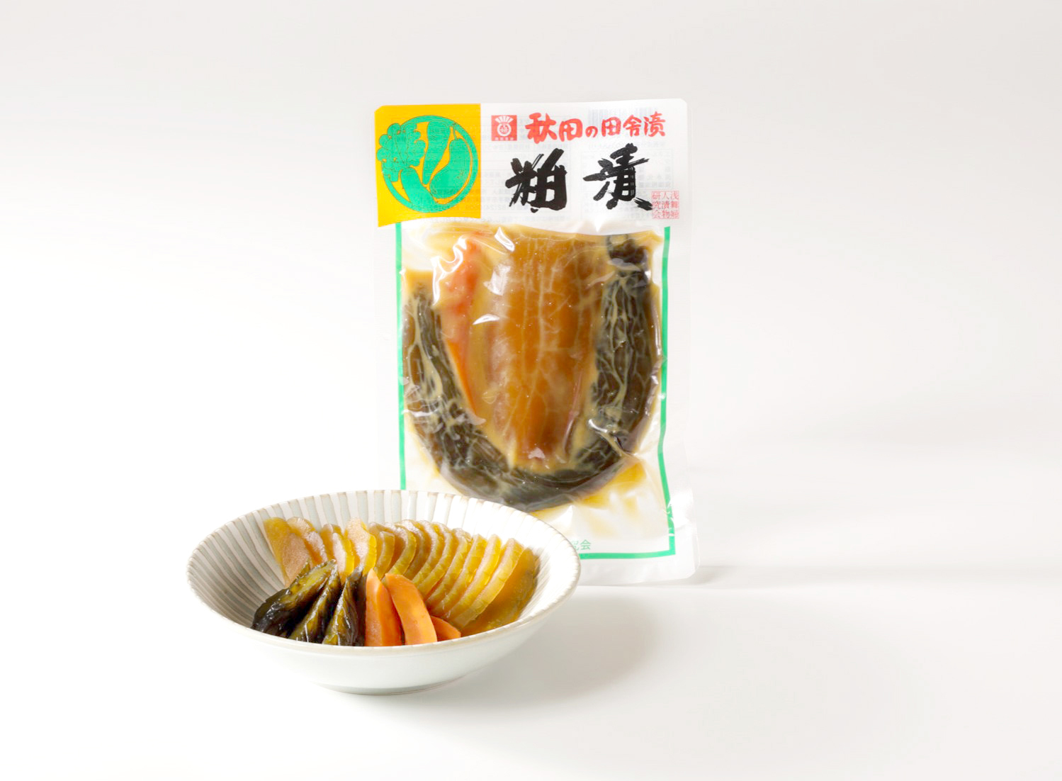 秋田酒蔵5蔵の酒粕を、浅舞婦人漬物研究会相伝の調合で作り上げた粕床に、厳選された秋田県産の野菜きゅうり、かたうり、にんじんを3回の漬け替えし、5ケ月漬込みし、こくとまろやかさを出しております