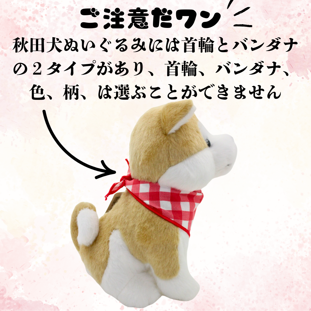 秋田犬ぬいぐるみには首輪とバンダナの2タイプがあり、首輪、バンダナ、色、柄、は選ぶことができません