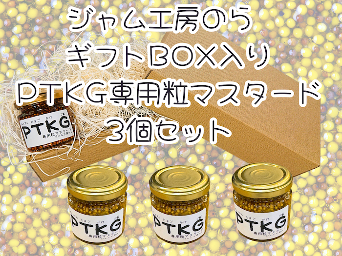 送料込みギフトBOXに入った、大人気のジャム工場のらさんの卵かけご飯専用TKG専用マスタードに、石孫本店の天然醸造醤油百寿と秋田県産あきたこまちの有機純米酢を加えたプレミアムなPTKG専用湯部マスタードの3個セットです