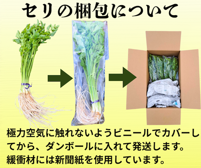 発送する際せりの一束は110g以上を確保しますが、輸送途中の環境によってはせりの水分の蒸発が進み110gを下回る可能性があることをご了承ください