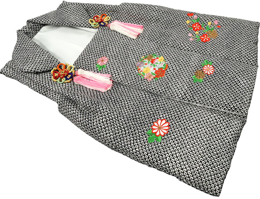 | 商品説明 | 疋田(絞り)柄に刺繍が入った被布コートになります。 是非お宮参り着物、七五三着物等と合わせてご使用下さい。 七五三や、ひな祭り、お祝い事等にご使用下さい。 黒地に小花の刺繍になります。 ※絞り柄になります。 ●内容● 被布コート ●品質、寸法● 表生地:絹100% 裏生地:ポリエステル100% コート丈50c
