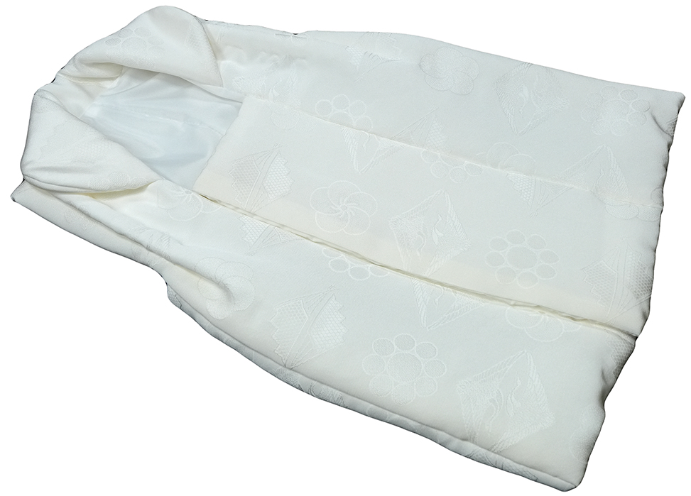 | 商品説明 | 上質な正絹の綸子生地を使用した、男児向け被布コートです。 生地全体には、細やかな吉祥文様が織り込まれており、 綸子ならではのなめらかな質感と、上品な光沢をお楽しみいただけます。 落ち着いたオフホワイト地は清らかで格式高く、 三歳の七五三など、晴れの日の装いにふさわしい一枚です。 ◆吉祥文様 地紋◆ 扇子・・・先が広がっていることから、お子様の未来が明るく開けることを願います。 梅・・・寒さに耐えて花を咲かせることから、清廉で力強く育つよう願う文様です。 九曜・・・星(宇宙)を表し、全方位からの守護を意味します。武家でも好まれた格の高い柄です。 鶴菱・・・「長寿」の象徴である鶴を菱形に図案化したもの。有職文様としての気品があります。