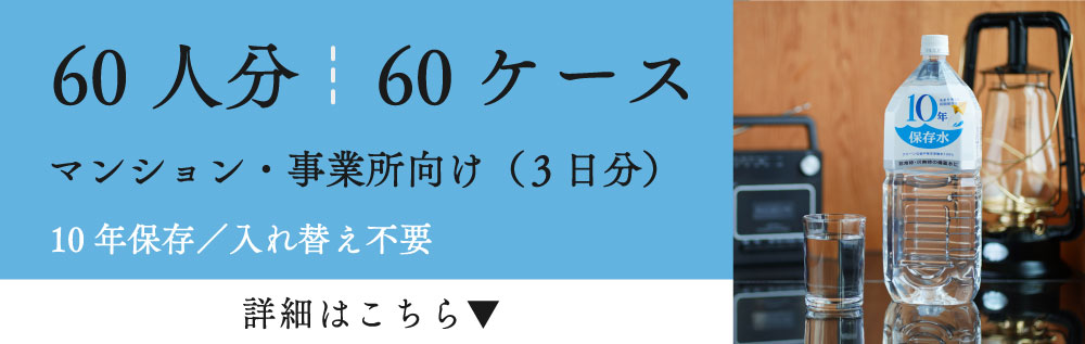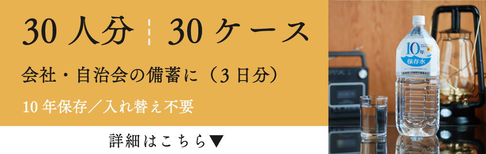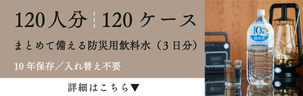 10年保存水とは「10年保存水」は、クリーンな室戸海洋深層水に超微細ろ過(半透膜を使用した逆浸透)をかけ、水以外の物質を可能な限り除去した10年以上保存が可能な純水(硬度0)です。積み重ねても崩れにくい頑丈なペットボトルを使用しているので非常時でも安心です。飲料水としてはもちろんのこと、料理(炊き出し)、赤ちゃんのミルク作り、お薬を飲むときにも最適です。