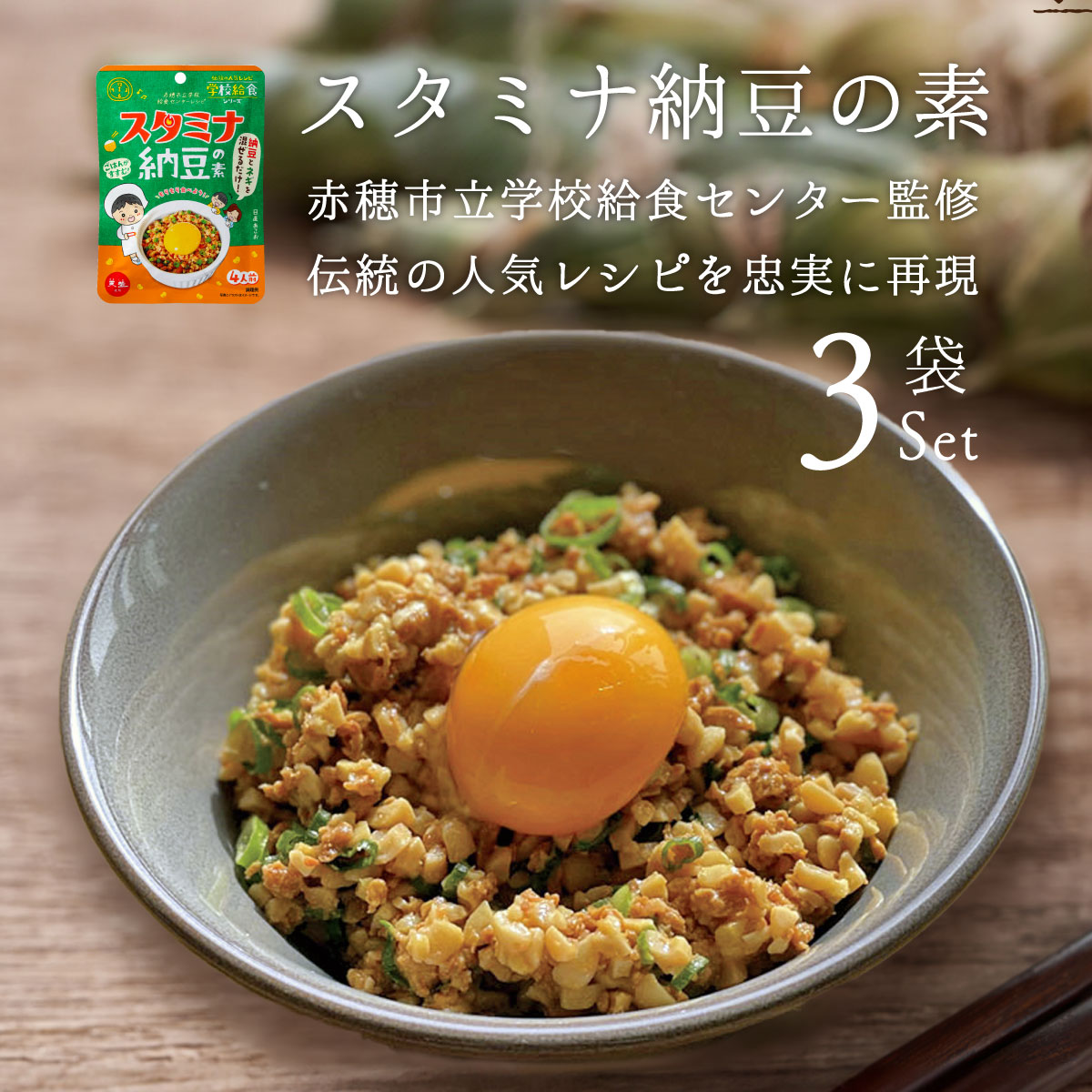 赤穂市立学校給食センターよりレシピ提供と味の監修をしていただき、にんにく生姜と醤油が香る、惣菜の素になりました。納豆が苦手な子どもにも美味しく食べられるように開発されています。