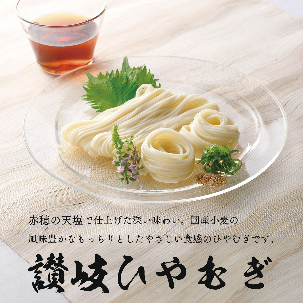 芳純ひやむぎは厳選した国産小麦を贅沢に使用し、赤穂の天塩で仕上げた深い味わい。