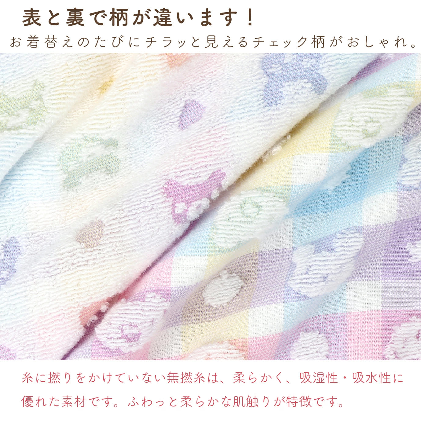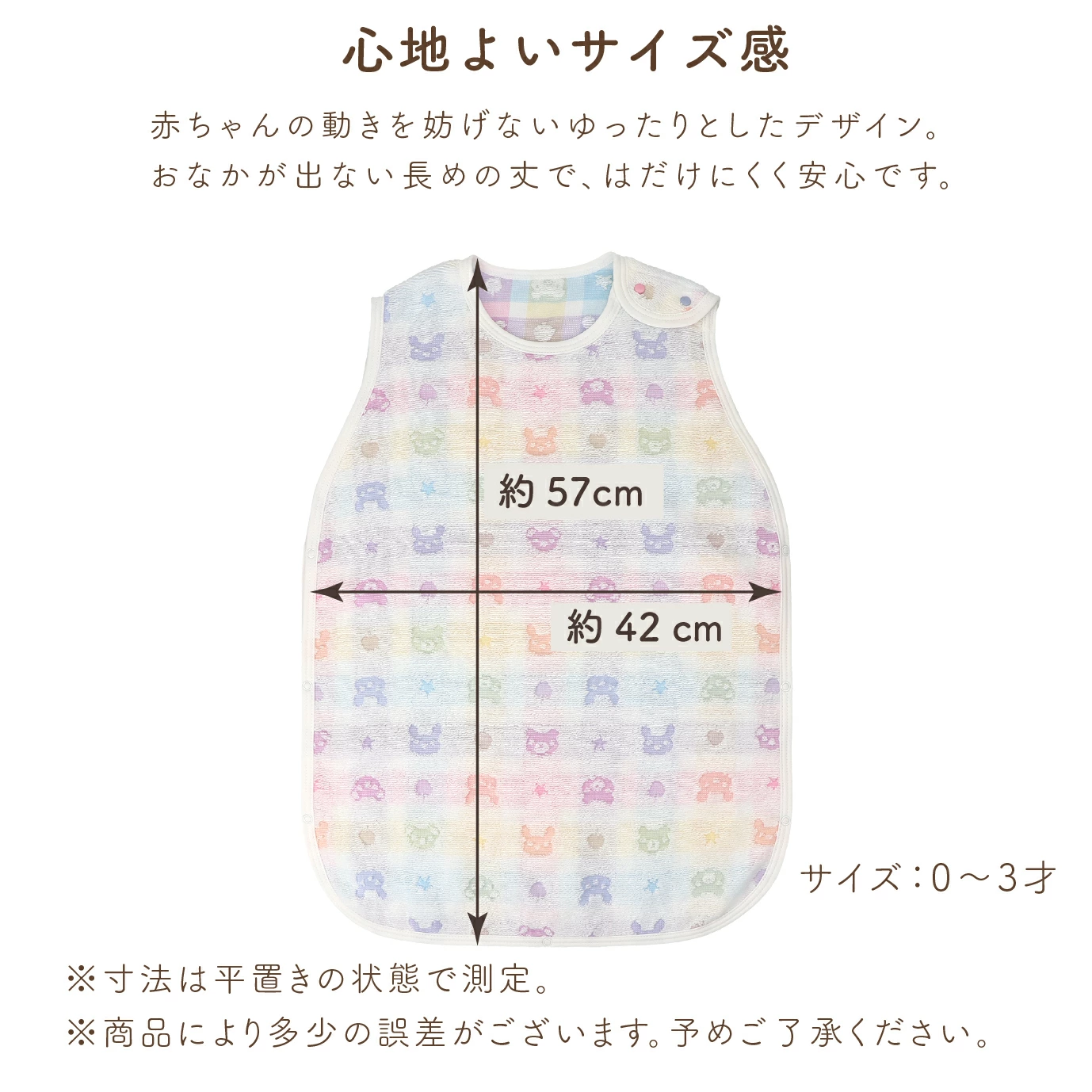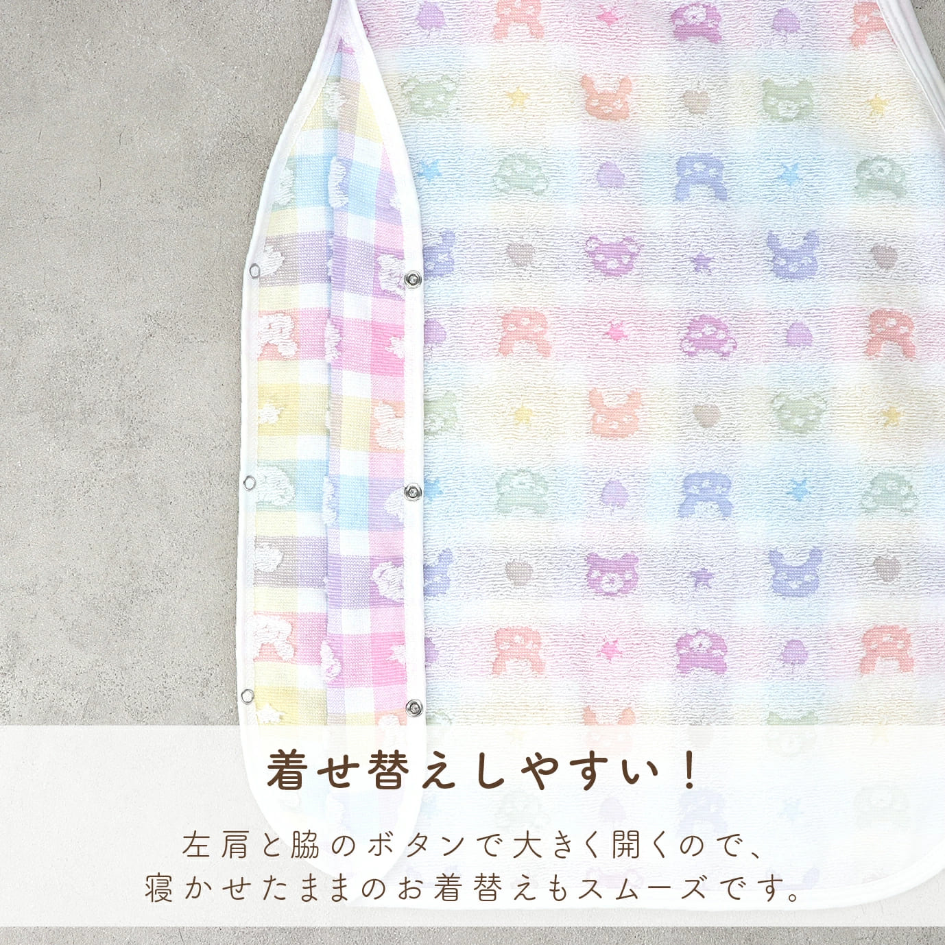 ふんわりとした肌ざわりのスリーパーです。無撚糸タオルジャカードは糸の撚りがやわらかく吸湿性・吸水性にすぐれています。少し薄手なので春夏におすすめです。おなかが出ないので、寝冷え対策に最適。両脇と肩が開くので、寝かせたままの着せ替えもスムーズにできます。