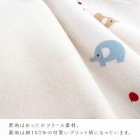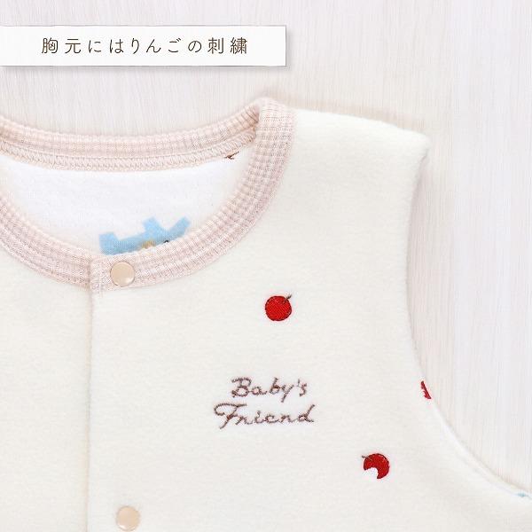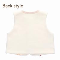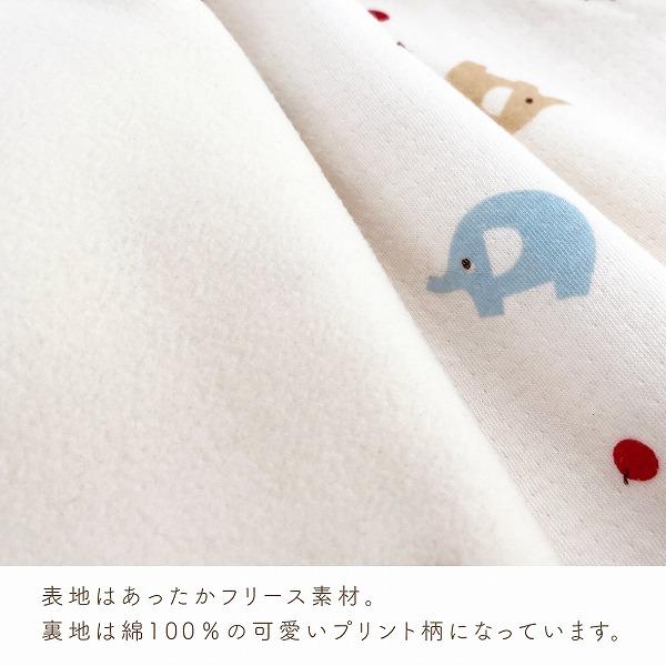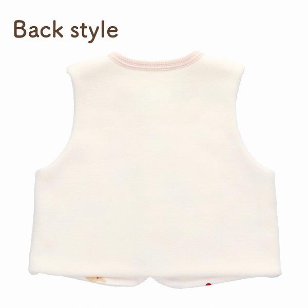 赤いりんごが大好き。元気いっぱいぞうさんが横からひょっこり顔を出しているので、思わずお母さんもにっこりしてしまう可愛らしいベストです。フリースと接結の2枚合わせになっているので、軽いのにとてもあったか。肌寒いお出掛けの日に是非ご活用ください。
