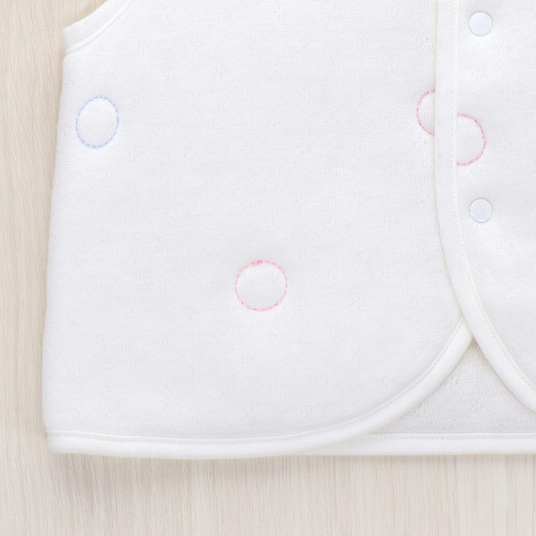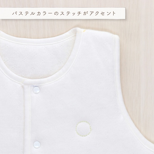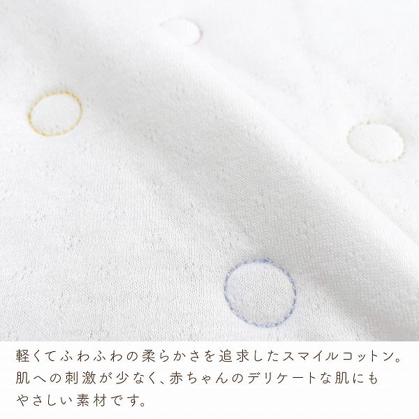 洗っても硬くならず、軽くてふわふわのやわらかさを追求したスマイルコットン。 肌への刺激が少なく、赤ちゃんのデリケートな肌にもやさしい素材です。 中わた入りのふんわりあたたかいキルトでパステルカラーのステッチがアクセント。 男女問わずお使い頂けるシンプルなデザインです。