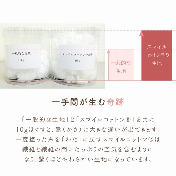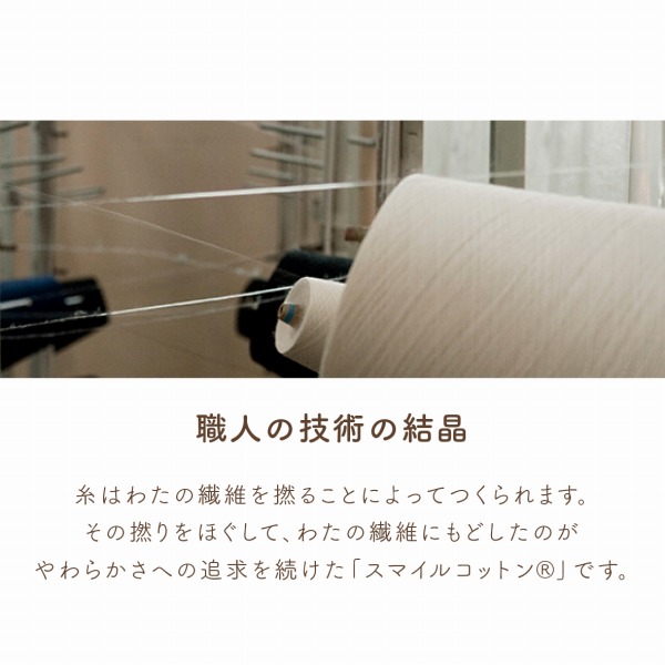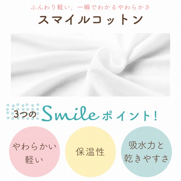洗っても硬くならず、軽くてふわふわのやわらかさを追求したスマイルコットン。 肌への刺激が少なく、赤ちゃんのデリケートな肌にもやさしい素材です。 中わた入りのふんわりあたたかいキルトでパステルカラーのステッチがアクセント。 男女問わずお使い頂けるシンプルなデザインです。 【スマイルコットン】 やわらかさの秘密は生地の製造過程。一度撚った糸ををほぐし、糸そのものを「わた」に戻すことで、ふんわりと軽い使い心地が続きます。その肌触りは敏感肌の方々にも喜ばれており、一般的な綿素材と比べて蒸散性が高く、乾きやすい素材です。