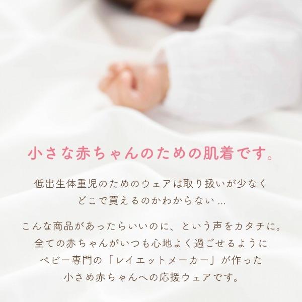 低出生体重児(2500g未満で生まれた赤ちゃん)のために開発した小さいサイズの肌着です。 デリケートな赤ちゃんの肌に刺激を与えないように、縫い目は平面縫製を採用。 オールシーズンお使い頂けるフライス素材は、伸縮性があり、肌にフィットして汗をよく吸収してくれます。