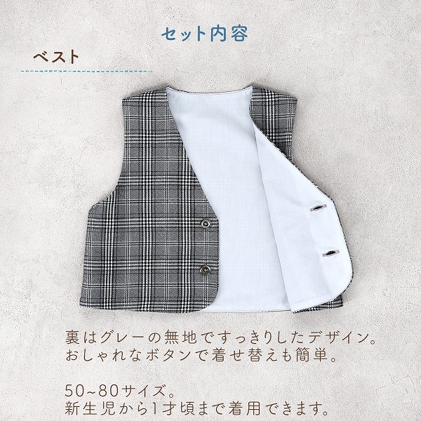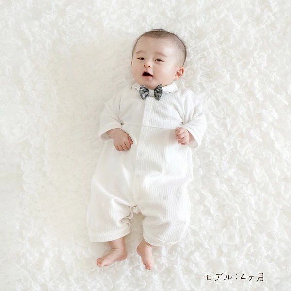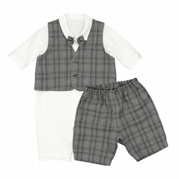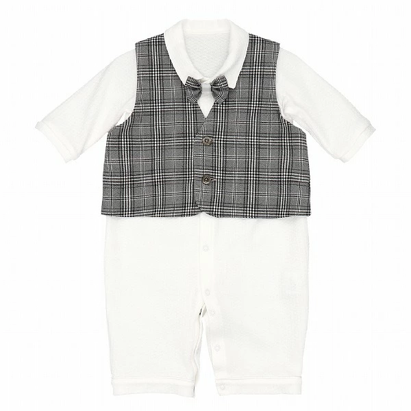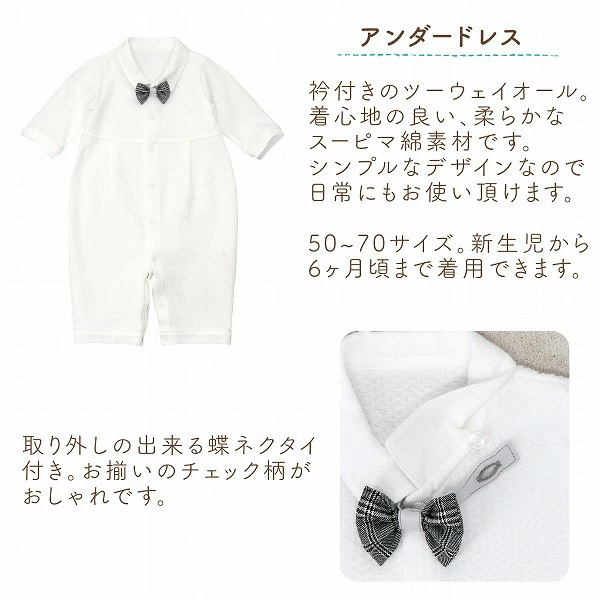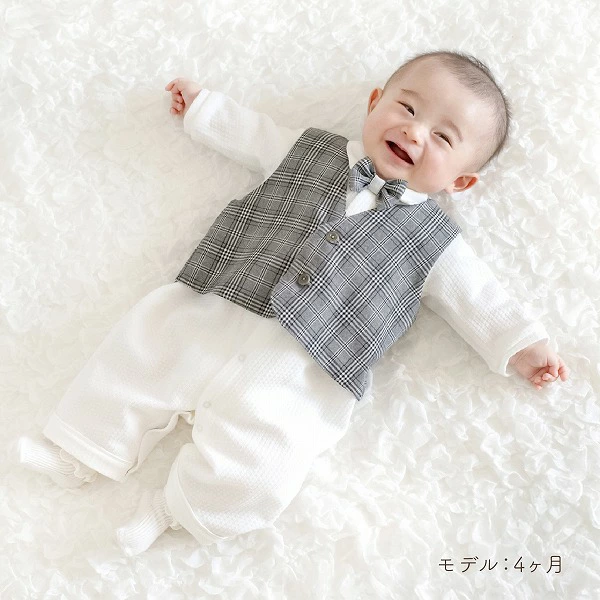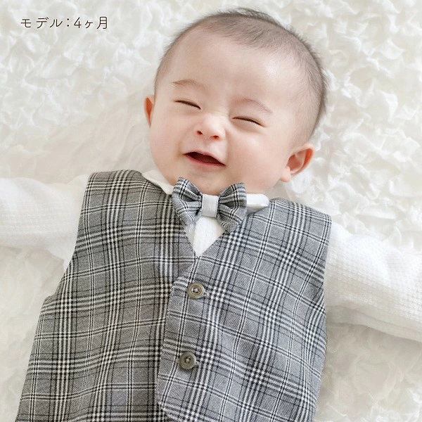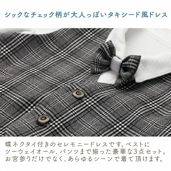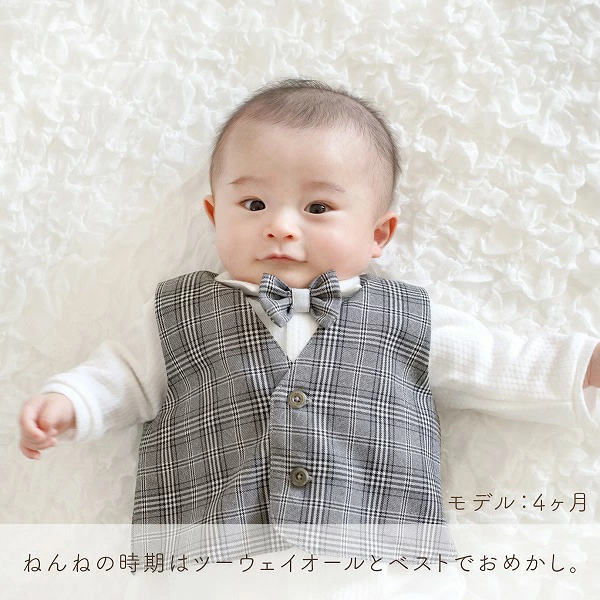 男の子にぴったり!蝶ネクタイがポイントのタキシード風セレモニードレスです。ベストにツーウェイオール、更にパンツまで揃った豪華な3点セット。大人カラーの上品なグレーのチェック柄がオシャレなパパとママに人気のデザイン。蝶ネクタイはボタンで取り外しが可能です。 ドレスとベストの組み合わせはもちろん、3か月頃からはベストとパンツにお手持ちのシャツ等の組合せで1才頃まで着用できます。あらゆるシーンで着て頂けます。お宮参りだけでなく、ご退院やお食い初めなど、赤ちゃんとご家族の大切な記念日を彩ります。 |