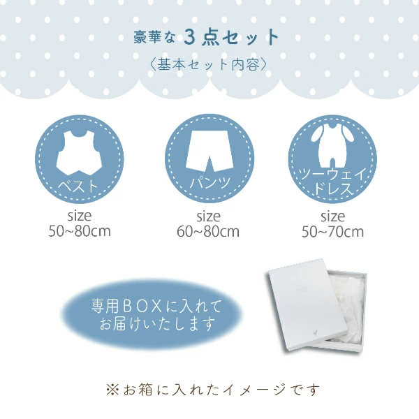 男の子にぴったり!蝶ネクタイがポイントのタキシード風セレモニードレスです。ベストにツーウェイオール、更にパンツまで揃った豪華な3点セット。大人カラーの上品なグレーに、さりげない水玉柄のアクセントが、オシャレなパパとママに大人気。蝶ネクタイはボタンで取り外しが可能です。ドレスとベストの組み合わせはもちろん、3か月頃からはベストとパンツにお手持ちのシャツ等の組合せで1才頃まで着用できます。 お宮参りだけでなく、ご退院やお食い初めなど、赤ちゃんとご家族の大切な記念日を彩ります。