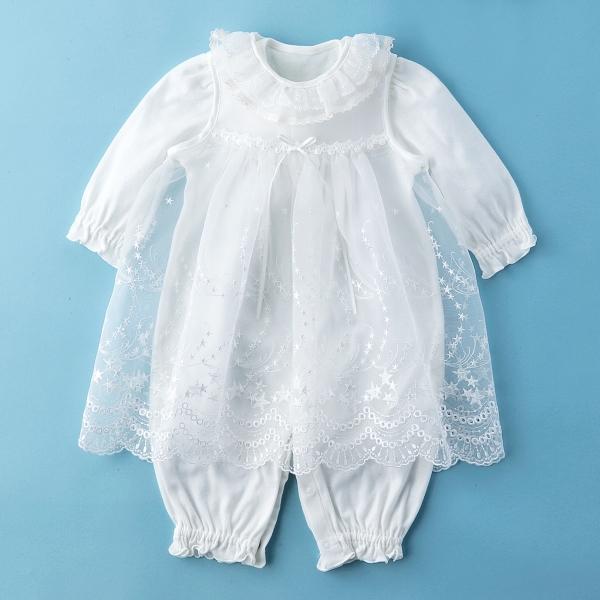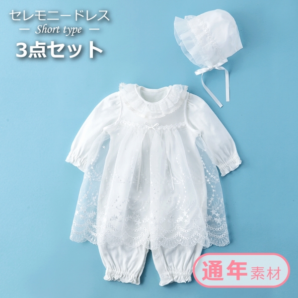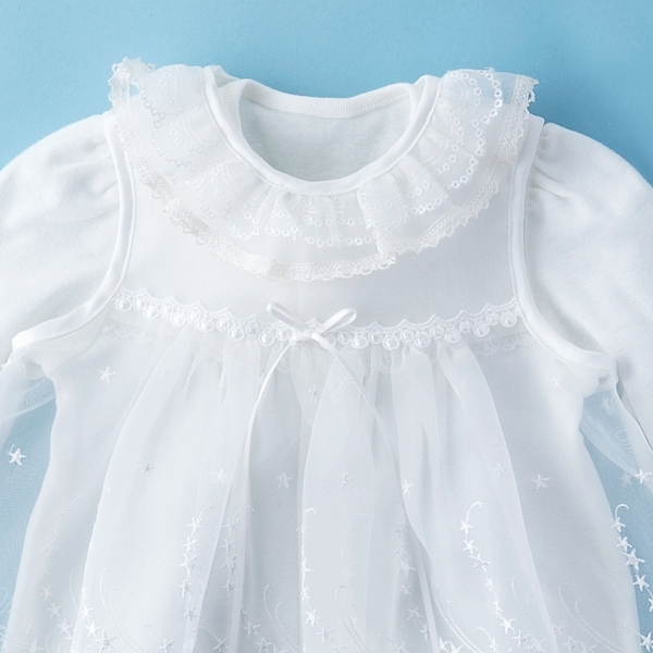 | 軽やかで可愛らしいショート丈のセレモニードレスです。コートドレスにツーウェイドレス、更にフードまで揃った豪華な3点セット。やわらかな光沢と透け感が美しいオーガンジーに、繊細な刺繍をほどこしました。ショート丈になっても変わらない贅沢なレース使いで、特別な1日を華やかに演出します。インナーのツーウェードレスはフライス素材を使用しているので、年間を通してお使い頂けます。お宮参りだけでなく、ご退院やお食い初めなど、赤ちゃんとご家族の大切な記念日を彩ります。 【お手入れ方法】 セレモニードレスは、フード、コートドレス、アンダードレスに分かれてますが、いっしょに洗わないと色が合わなくなりますので、必ず同時に洗うようにしてください。 また赤ちゃんのウェアーは直接肌に触れるものが多いので、蛍光増白剤が入っていない洗剤をお勧めします。(手洗いの場合は押し洗い)(洗濯ネット使用) 商業クリーニングでも、洗濯に出されるときは一言「傾向増白剤は使わないで」と言われることをお勧めします。 |