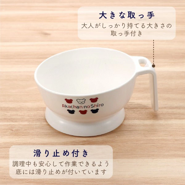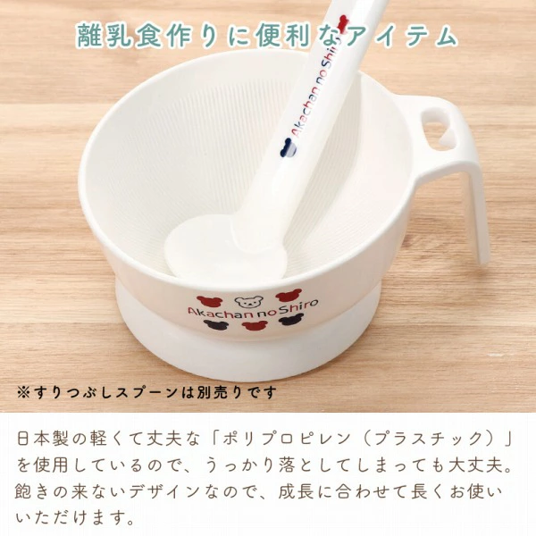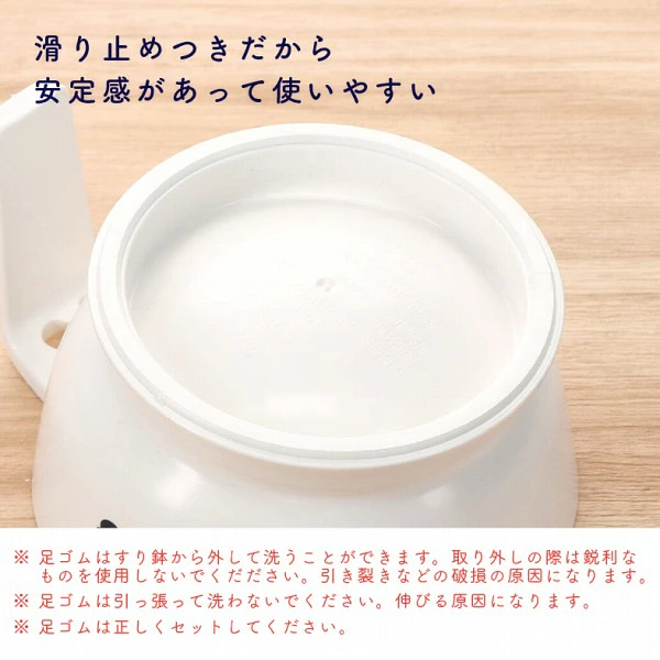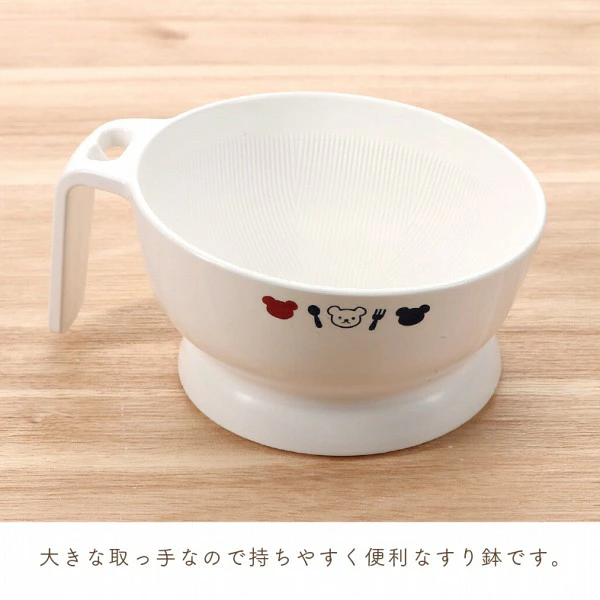 初期の離乳食作りに便利なアイテムです。 底に滑り止めが付いているので安定感があり、持ち手も付いて使いやすい、すり鉢です。