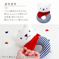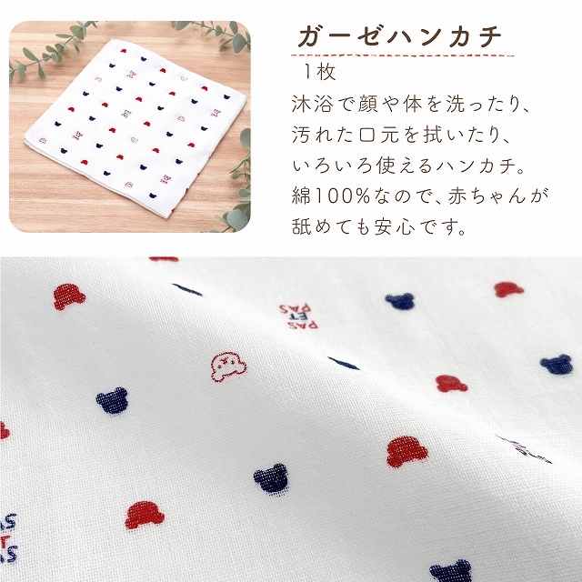 ●トートバッグ、ガーゼハンカチ、スタイ 綿100% ●ガラガラ 頭部:綿75%×ポリエステル25% リング部:綿100% (プラスチック製鈴入り) ●ソックス 綿・アクリル・ナイロン・ポリウレタン