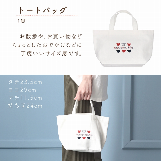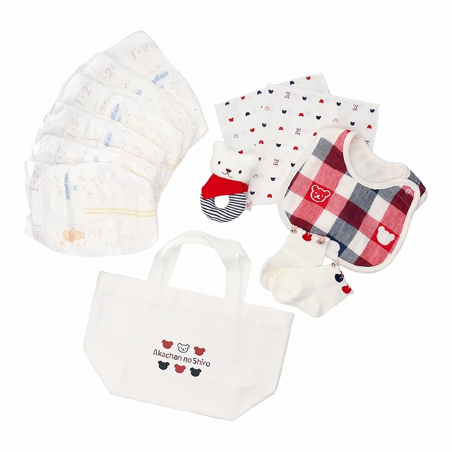 ●おむつMサイズ(6枚) ●トートバッグ タテ23.5cmヨコ29cmマチ11.5cm持ち手24cm ●ガーゼハンカチ 34×34cm(1枚) ●スタイ ●ガラガラ ●ソックス9〜11cm |