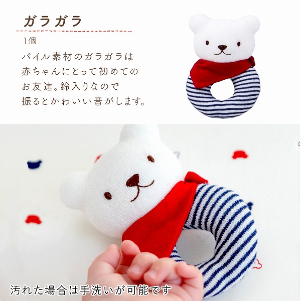トリコロールカラーのかわいいくまさんのギフトセットです。 実用的なおむつ入りトートバッグのギフトは、出産のお祝いにぴったり。 男女問わないデザインと充実のセット内容、安心・安全の日本製にこだわりました。