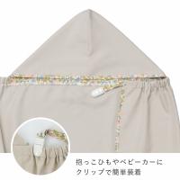 UVカット加工を施したケープで紫外線をカット! 赤ちゃんとのおでかけも安心です。 日差しが気になるときにさっとかぶれるフード付き。 抱っこひもだけでなくベビーカーなどにもクリップで簡単に取り付けできます。
